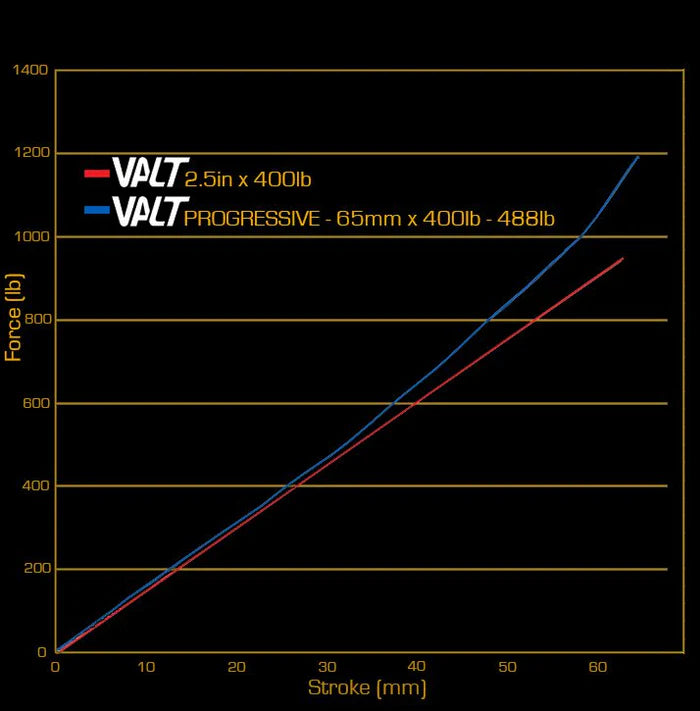 Due to their linear nature, coil shocks typically are best paired with bikes that feature progressive suspension kinematics. In the context of discussing bike frame design, the term progressive means that the leverage that the frame exerts on the shock is very high initially, and then decreases as the bike moves through its travel. This means that towards the end of travel, the rear triangle and linkage have much less leverage to compress the shock. This gives the suspension more support at this stage, making it harder for the frame to bottom out the shock. Bike manufacturers will sometimes list the progression of the suspension with their bike’s specs online. Look for a change in leverage that’s about 20% or more for ideal coil compatibility. If your bike is not very progressive, or you know it was strictly designed for air shocks, you can use one of our progressive VALT springs to add some additional end-stroke support.